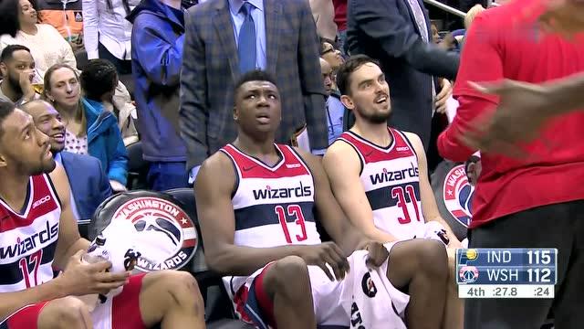 最后时刻,球到了麦科勒姆手里。这老哥也没慌,运球到前场,面对防守,干拔跳投——球在空中划了一道弧线,打板入网!114比113,奇才反超!留给雄鹿的时间只剩1秒 -2。