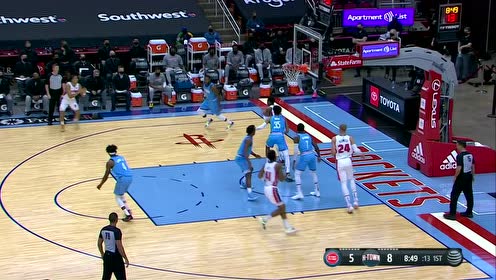 易边再战,火箭的防守强度骤然升级。乌度卡祭出夹击康宁汉姆的杀招,令活塞核心在前8分钟仅出手2次-16。第11分21秒,活塞以54-53领先1分,这成为他们本场最后的领先时刻。
